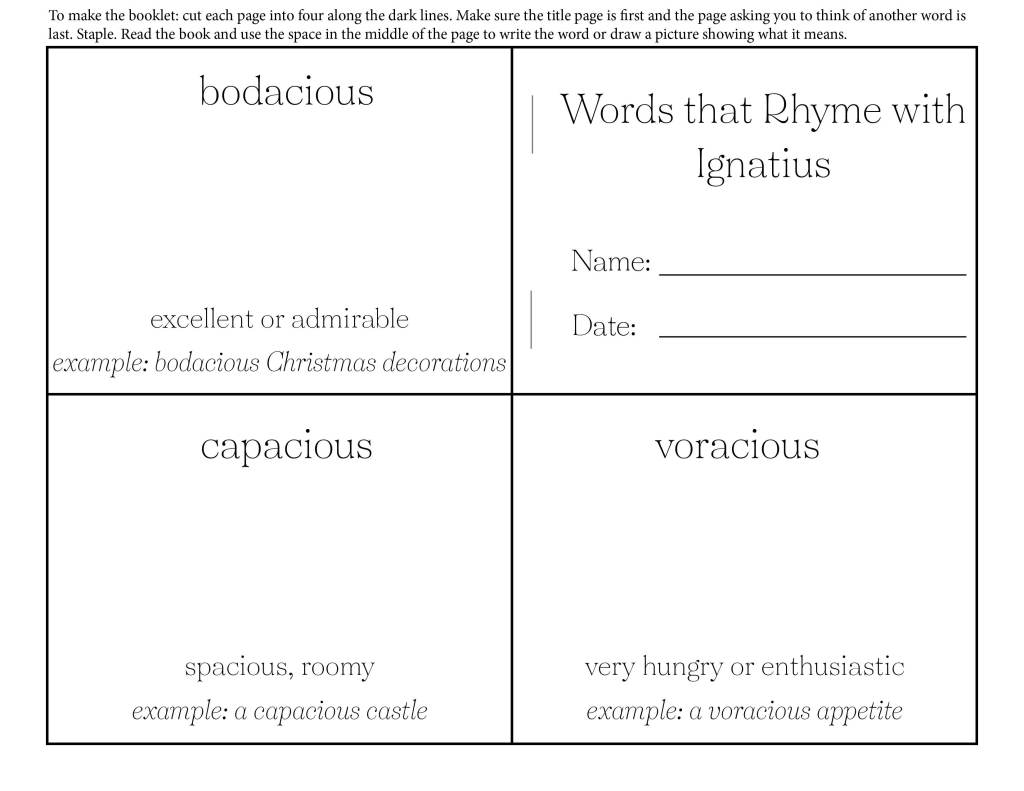 It’s no secret that Audacious Ignatius will build your vocabulary! If you want to spend some time learning some new words that rhyme with Ignatius, this activity will help you make a vocabulary booklet. Kids can read the words and definitions, and draw a picture of what the word means. This has been our most requested resource from teachers!