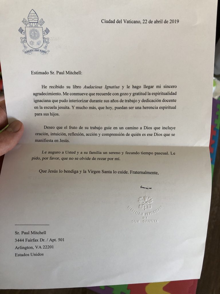 I have received your book Audacious Ignatius and I send to you my sincere gratitude. I am moved that you recall with gratitude and joy the experience of Ignatian spirituality that you were able to internalize during your years as a teacher in Jesuit education. And much more, now, that it will be a spiritual inheritance for your sons.