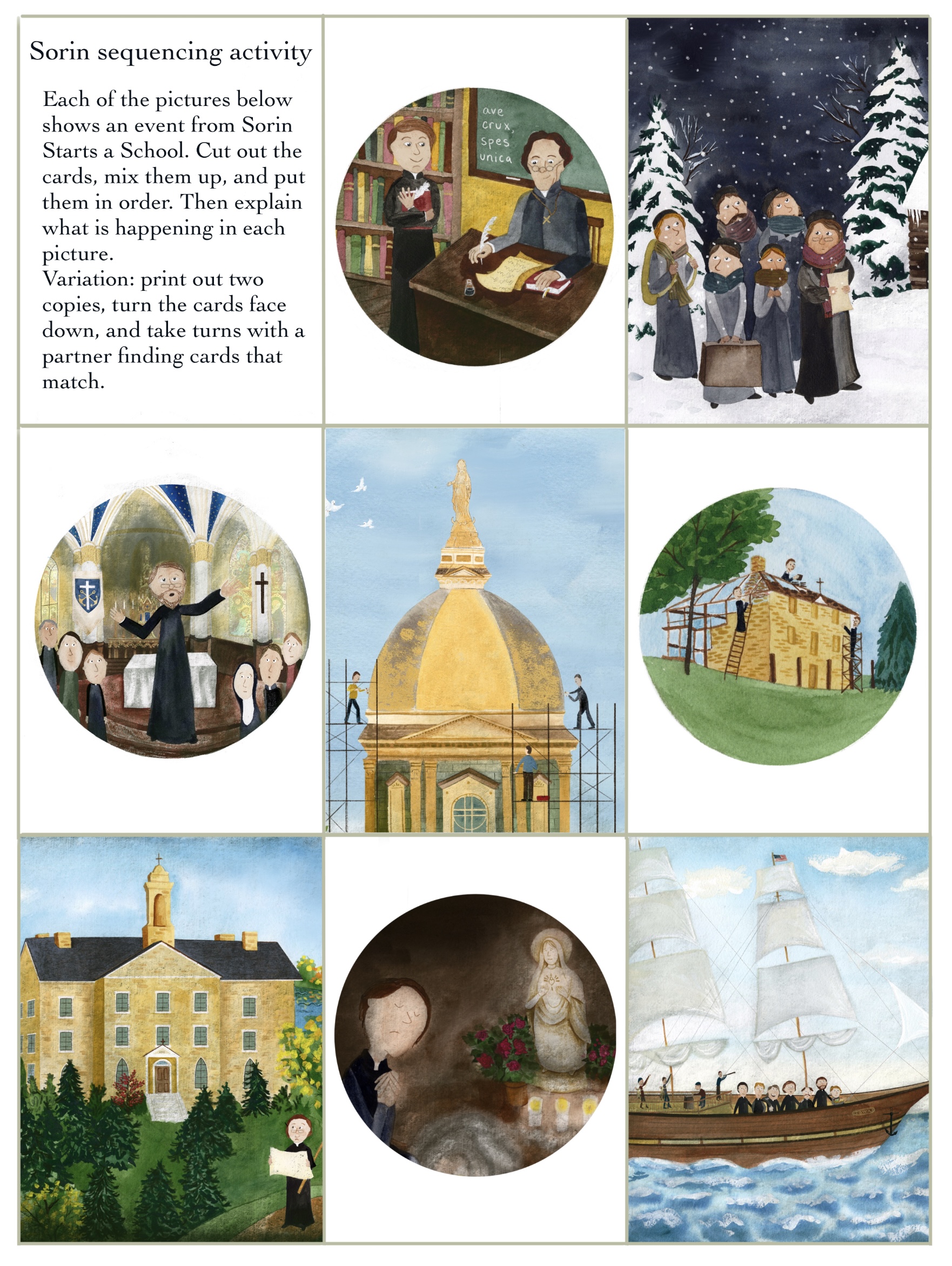 This activity is for for teachers, parents, or homeschoolers to accompany the reading of Sorin Starts a School. Suitable for children ages 2-7, this activity will assist children with describing and putting in order the events in the life of Fr. Sorin.